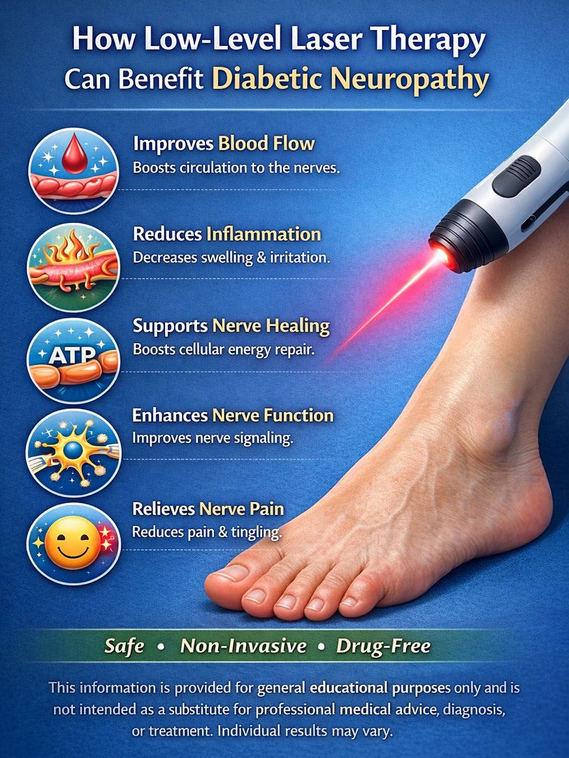 Low-level laser therapy (LLLT)/laser acupuncture, also known as photobiomodulation, is a gentle, needle-free treatment that may help support nerve health in people with diabetic neuropathy.